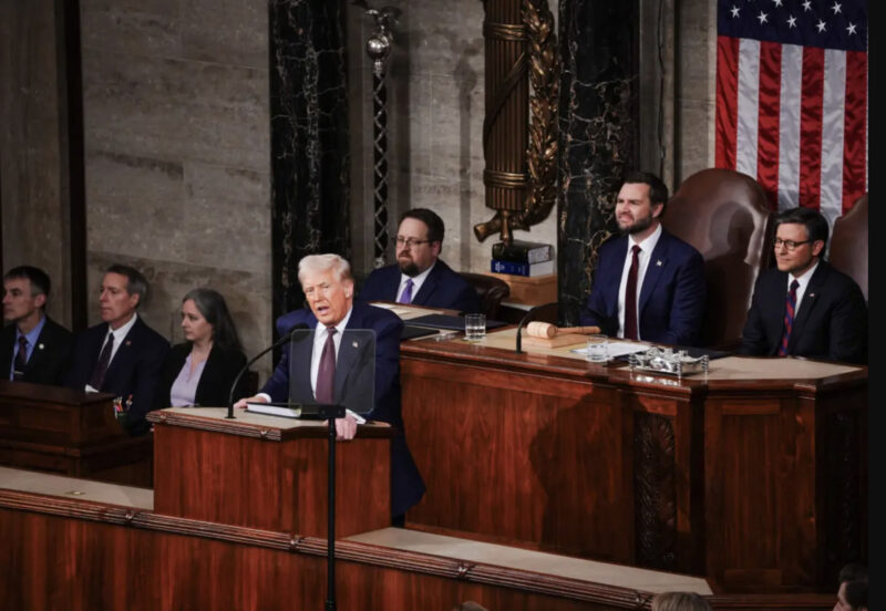 The immediate impact of Trump evident of the audience, with Republicans chanting USA! and Democrats standing and applauding during the welcoming of the US Olympic men's hockey team to the gallery. partisan country's discussion of tariffs prompting president's decision to push broad tariff regime many of the may economic consequences for the country.